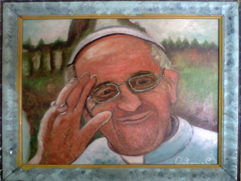 dipinto ad Olio su tavola 35x45 compreso di cornice 2014 autore Antonio cariola il dipinto raffigura papa francesco che saluta