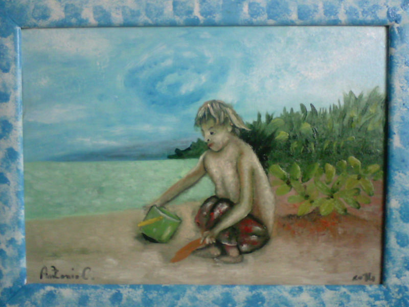 Questa dipinto ad Olio su tela dimensione 40x50 con cornice dipinta a mano Autore Antonio cariola l'opera in visione raffigura un ragazzo che si prende la sabbia con la paletta e il secchiello